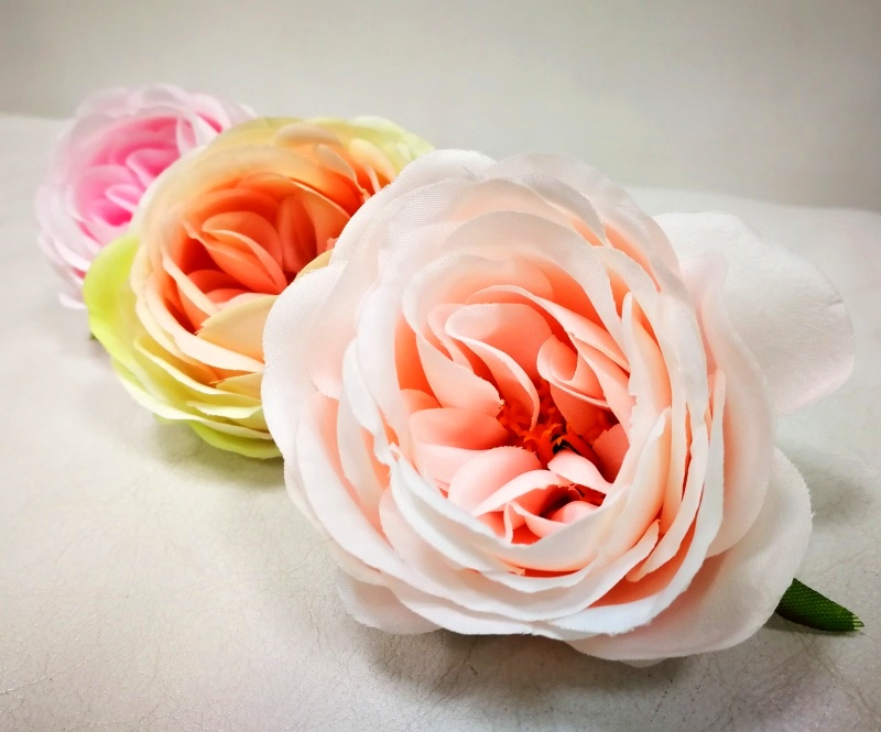 Textilní hlavičky růží plnokvětých připomínající pivoňku.