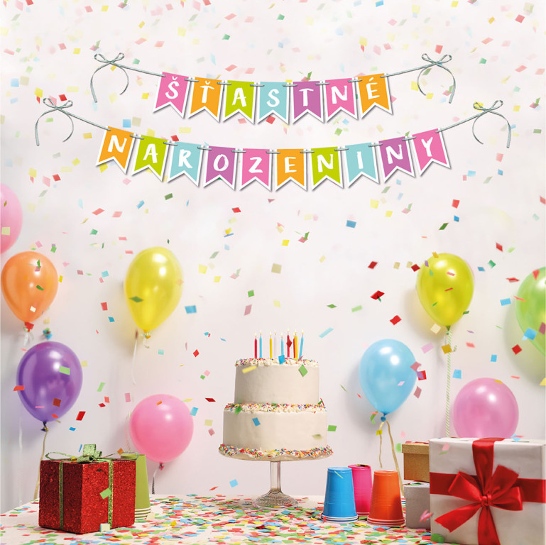 Balení obsahuje papírové vlaječky s textem ŠŤASTNÉ NAROZENINY.