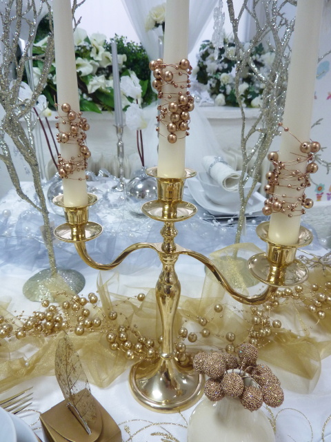 kovový lesklý  svícen na 3 konické svíce, elegentní ozdoba každé slavnostně prostřené tabule.